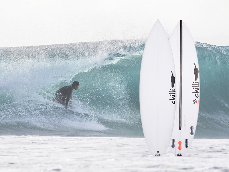 A new model Chilli has created from the Fader. Designed to be ridden 1 inch shorted then your Fader. This is a board you can trust: if you had an around-the-world trip booked and only room for 1 surfboard, this would be it. Let's break down the key strength elements: a strong board plays a huge part in having trust in your board when the waves are good. This board is glassed with 6 oz x 4 oz deck / 4 oz + Innegra + twin carbon strip bottom. The Twin carbon is designed to reinforce the body of the board down the centre and the Innegra is woven into the bottom roll of 4 oz fibreglass and assists with flex so your board still performs at a high level. It's designed to be strong and perform. Over the test drive period (past 12 months) this board was ridden by Jay Davies and Luke Egan, both big builds and heavy footed surfers. The design: Chilli has taken the Fader (a popular Chilli model for good to excellent wave types) and added more foam in the centre of the board, allowing more paddle power. The rocker is a very smooth entry in the nose with a flow all the way out through the tail. It rides silky smooth out on the face and tight in the pocket. A med/low rail to bite into the water but not too low. It's very forgiving. Bottom contour is a shallow single concave right through the board, enough for speed but shallow enough to keep flow in all conditions. Having the continuous outline into a neat round tail, this board is a pleasure to ride!